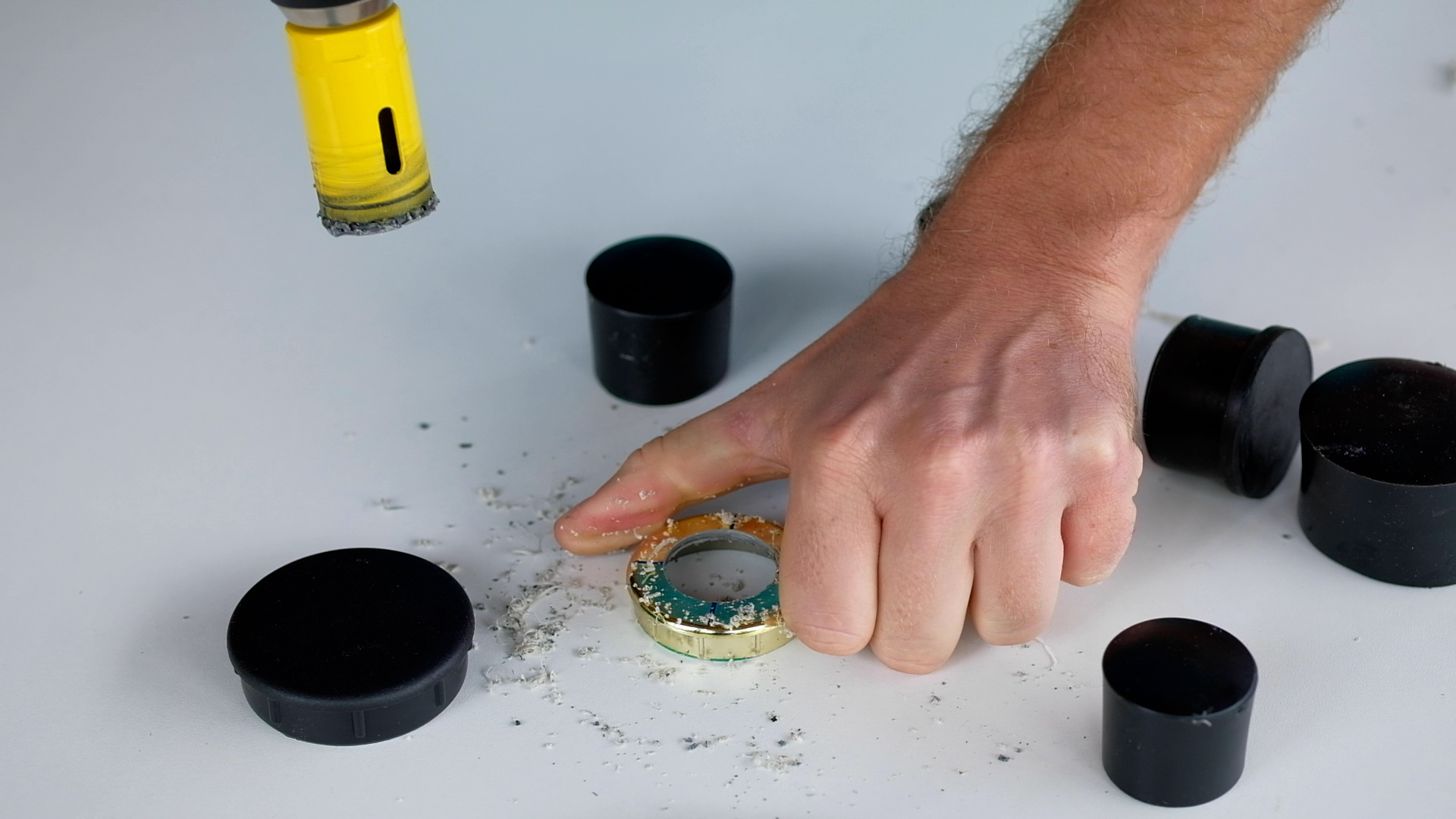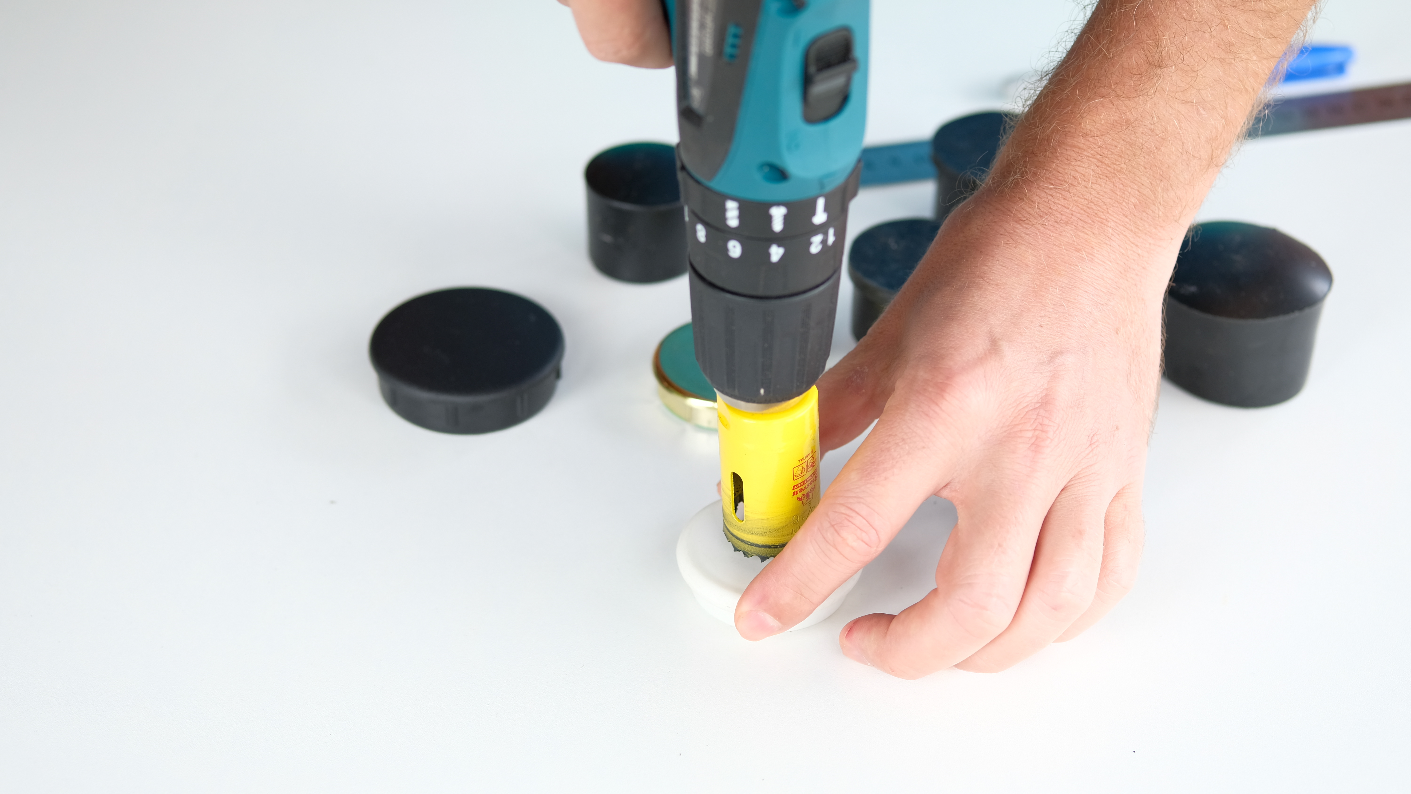 Usando uma serra-copo, faça um furo na tampa. (o diâmetro da serra-copo deve ser um pouquinho menor do que o piezo)