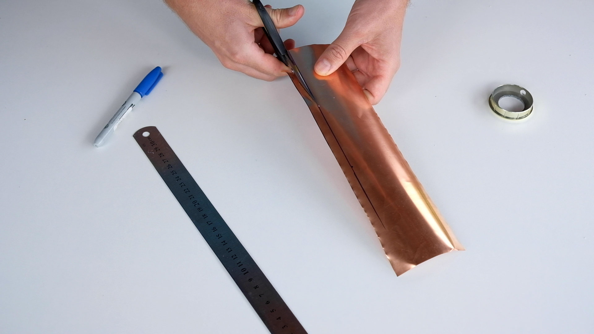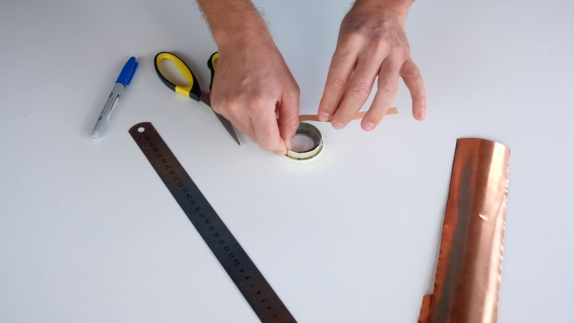 Corte a folha de cobre em uma tira com a mesma altura da tampinha.